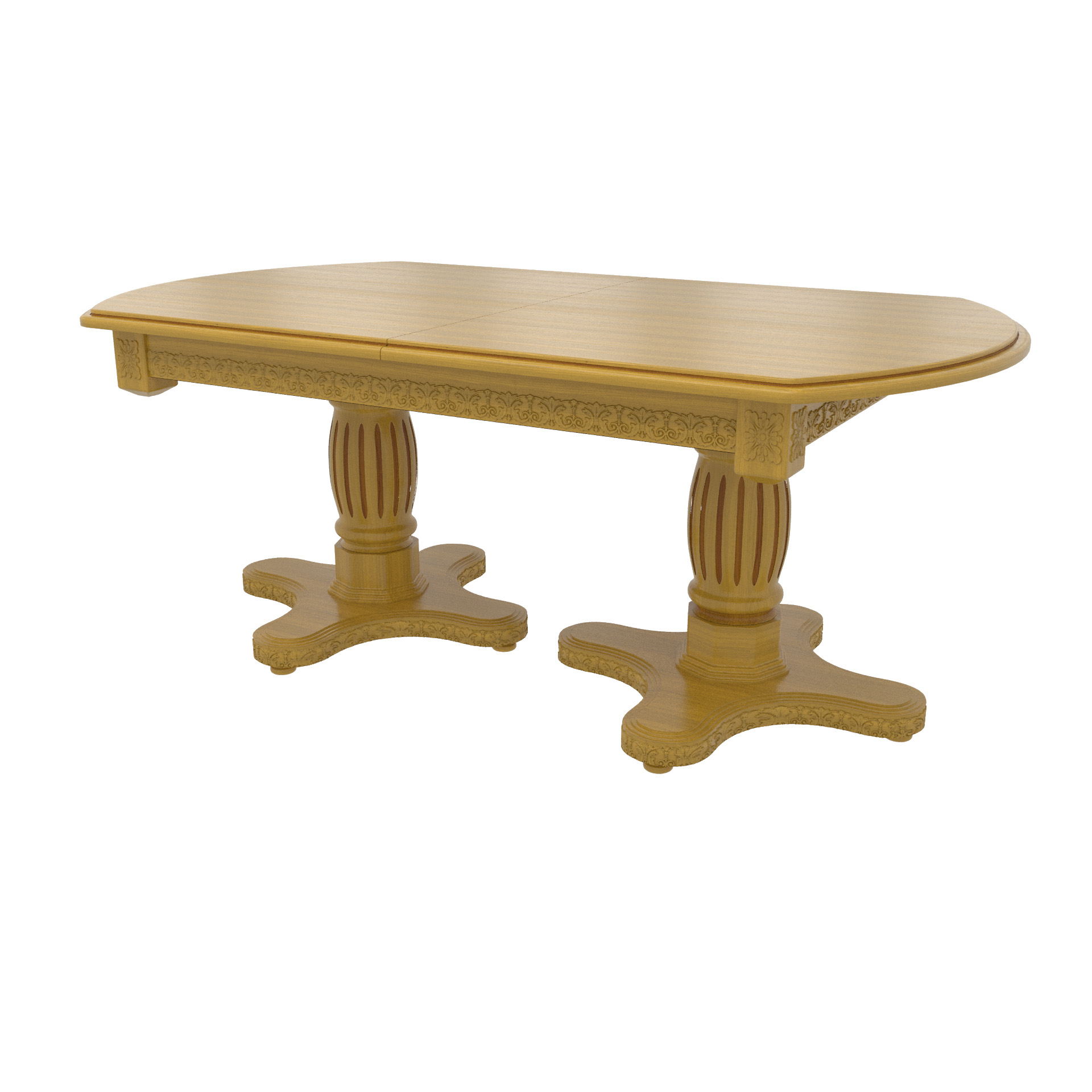 Большой овальный стол из массива березы, который с помощью трех вставок может быть увеличен почти вдвое. В собранном виде вставки находятся внутри стола. Одна из трех тонировок дерева на выбор покупателя.