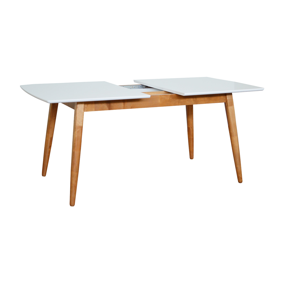 Лаконичный стильный раздвижной стол для современных интерьеров. Столешница выполнена из МДФ, остальные элементы – массив березы. Два размера на выбор покупателя и широкий ассортимент тонировок дерева.