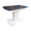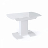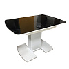 Недорогая функциональная и стильная модель. Каркас стола изготовлен из ЛДСП, цвет белый или венге. Столешница из МДФ с закаленным стеклом, матовым или глянцевым на выбор. Имеет полуовальную форму, размер 110 см с возможностью увеличения еще на 30 см. Опирается на одну ножку, переходящую в две плоские опоры на полу.