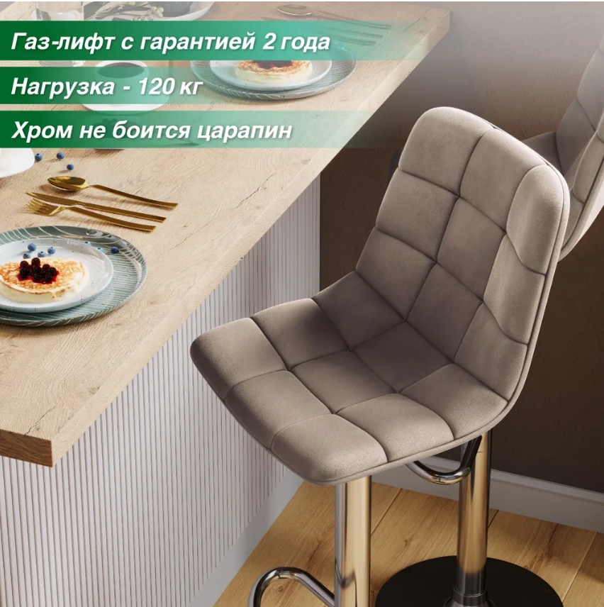 Барный стул оснащен подъемно-поворотным механизмом типа газлифт. Благодаря этому, стул подойдет к любой барной стойке и будет удобен любому — ведь высоту сиденья легко отрегулировать. Барный стул вращается на 360 градусов. Хромированная опора не боится царапин и придаёт стулу изысканный стиль. Основание снабжено нескользящей резиновой накладкой, что делает передвижения стула бесшумными и не оставляет следов на половом покрытии. Стул имеет удобную опору для ног.