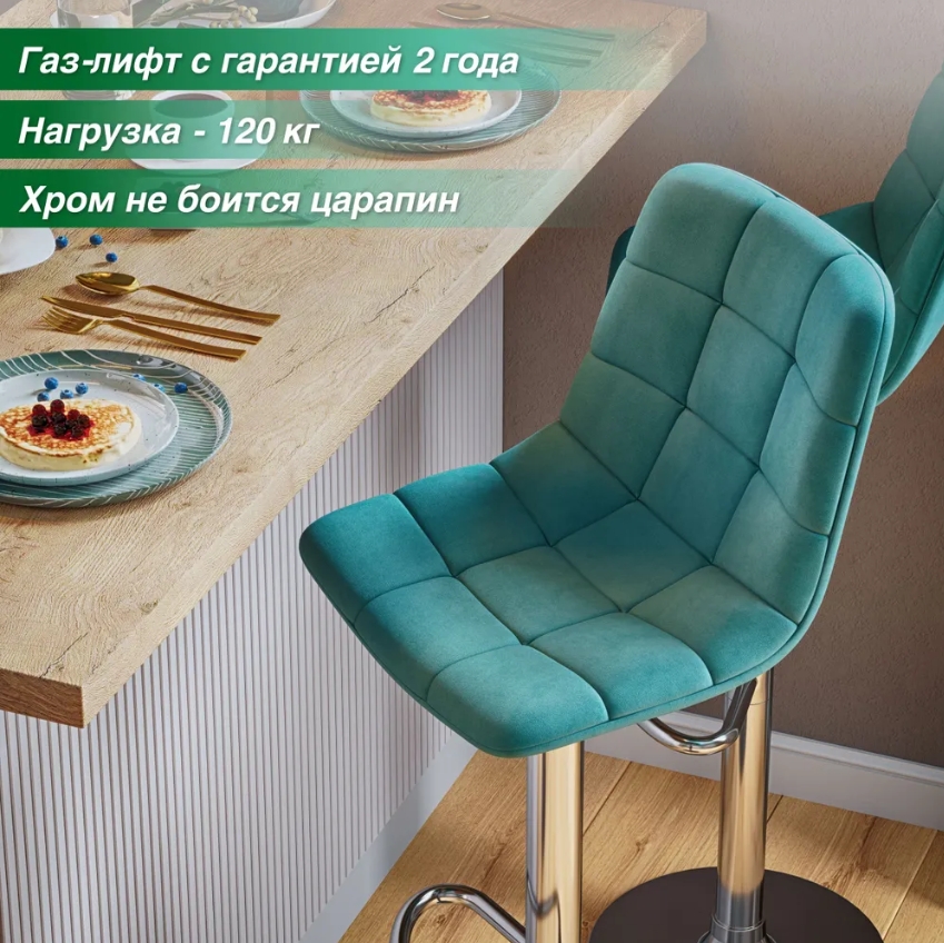 Барный стул оснащен подъемно-поворотным механизмом типа газлифт. Благодаря этому, стул подойдет к любой барной стойке и будет удобен любому — ведь высоту сиденья легко отрегулировать. Барный стул вращается на 360 градусов. Хромированная опора не боится царапин и придаёт стулу изысканный стиль. Основание снабжено нескользящей резиновой накладкой, что делает передвижения стула бесшумными и не оставляет следов на половом покрытии. Стул имеет удобную опору для ног.