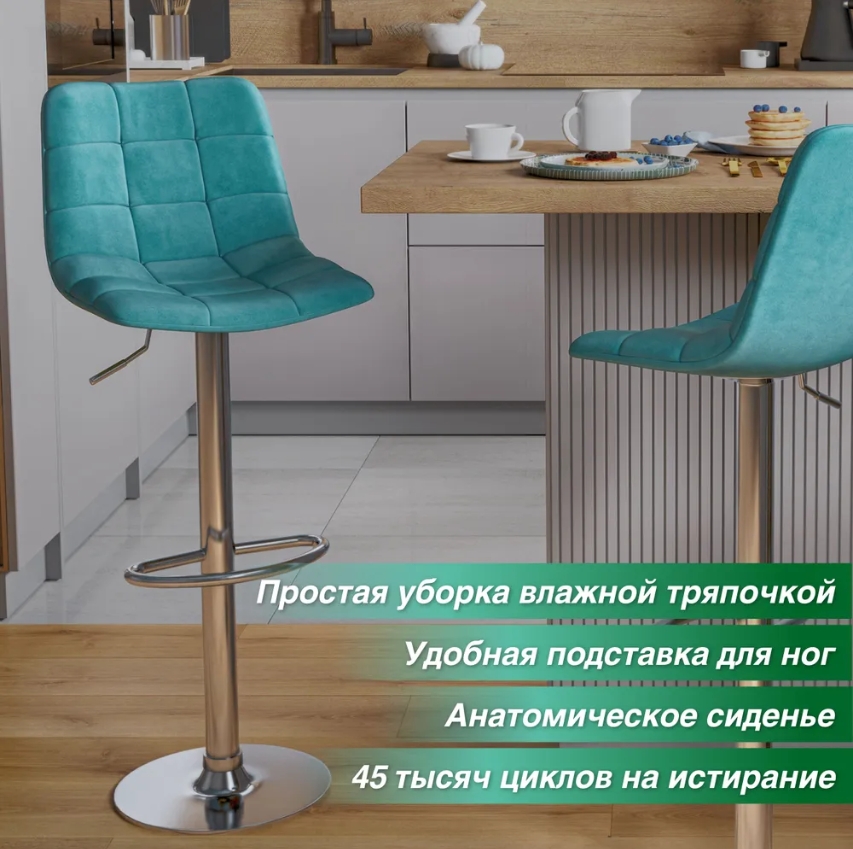 И это всё то же мягкое сиденье Чили с обивкой из премиум-велюра. Износостойкий (45 тысяч циклов по Мартиндейлу на износ), бархатный и приятный на ощупь, он разительно контрастирует с искусственной кожей, которая так популярна в барных стульях. При этом в практичности наш велюр не уступает экокоже. Любое загрязнение легко очищается влажной тряпочкой в мыльном растворе.